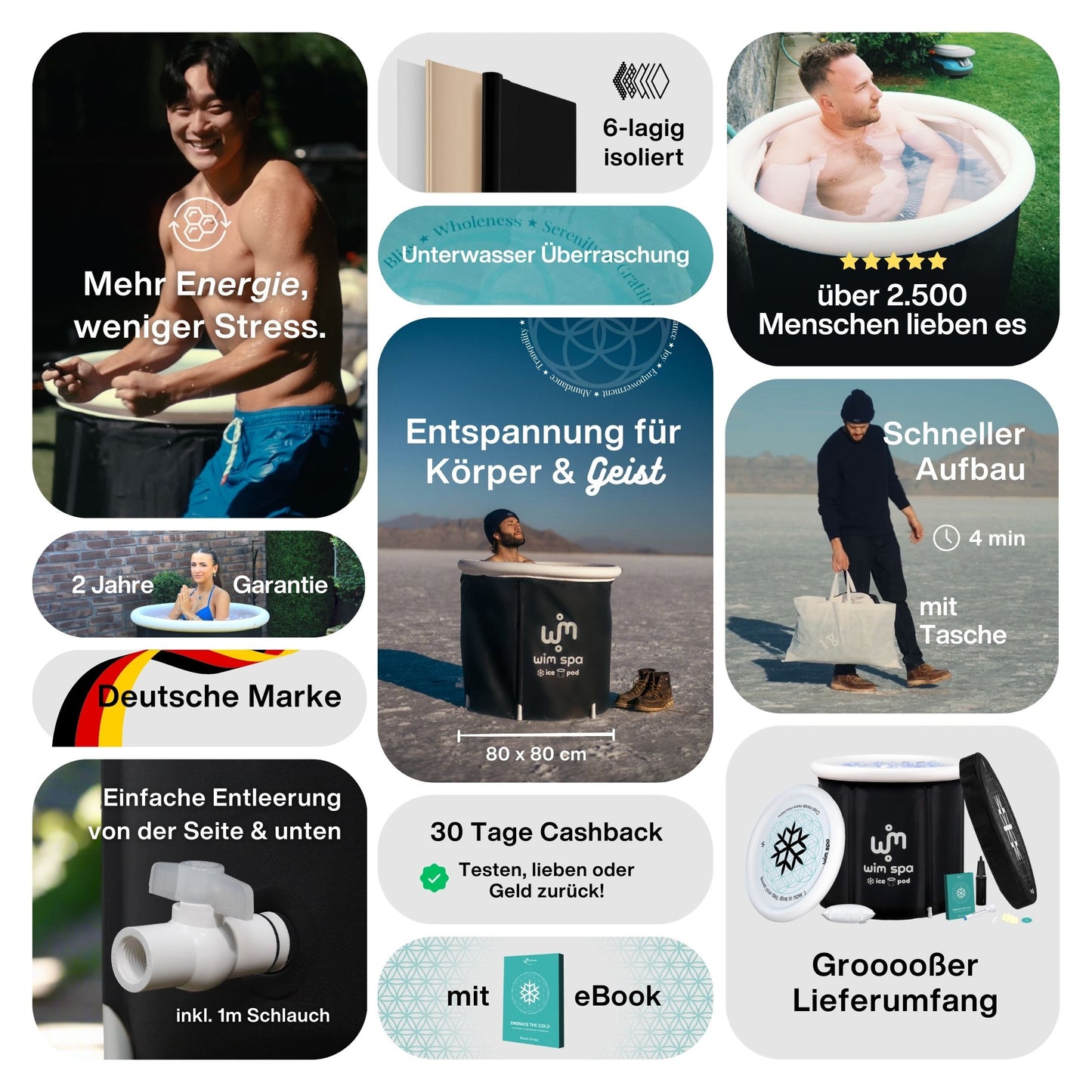 The WimSpa Ice Pod Set contains everything you need for effective ice bathing: Pump, seat cushion, thermometer, drain hose and protective cover – compact and well-designed. With the carrying bag, repair patches and an e-book with tips, you are perfectly prepared for your cold routine at home or on the go.