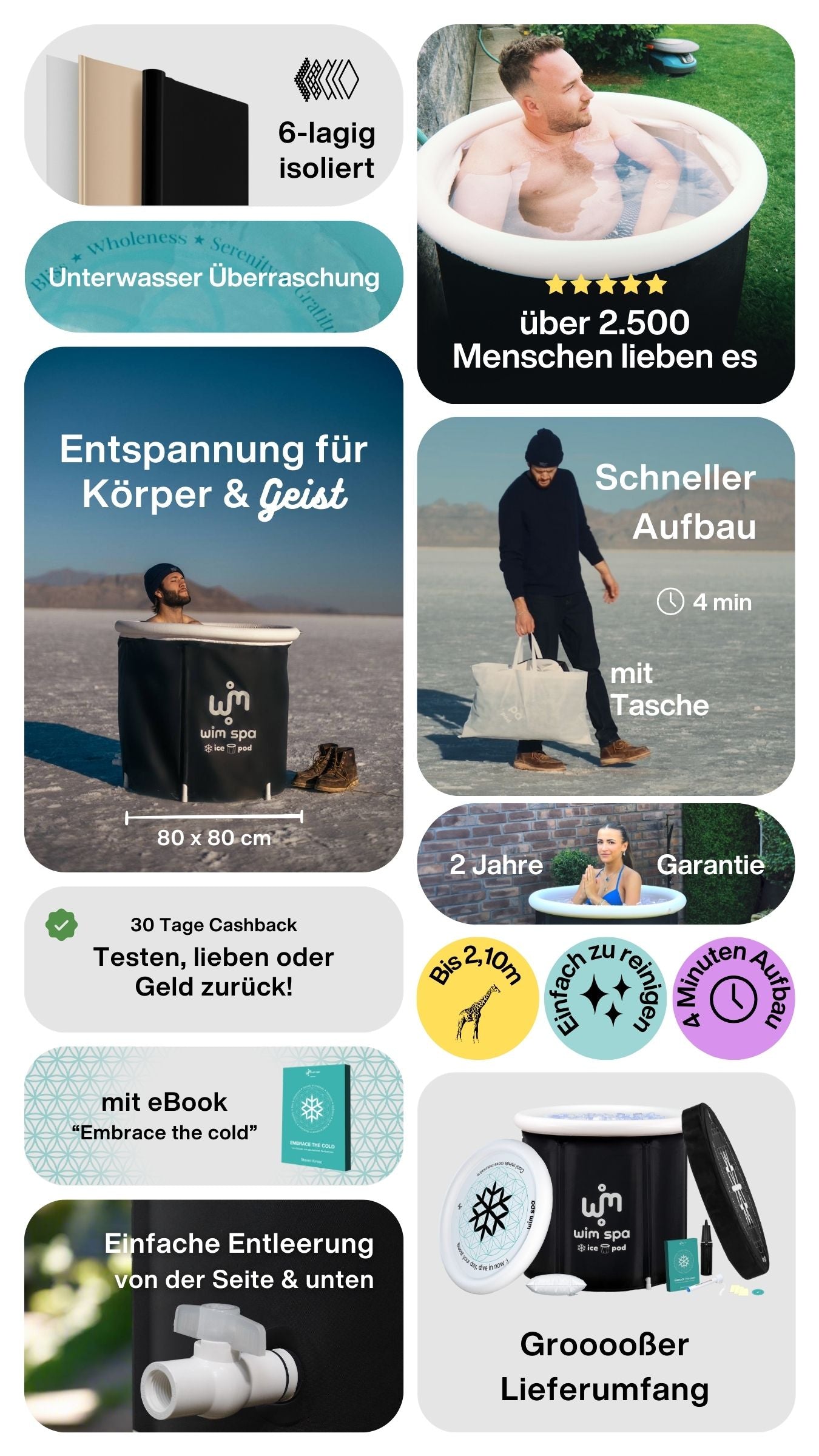 Experience natural energy and mental clarity with the WimSpa Ice Pod – completely caffeine-free. Even just a few minutes in ice-cold water activates your body, promotes blood circulation, increases focus and mood, and gives you a deep feeling of calm and strength.