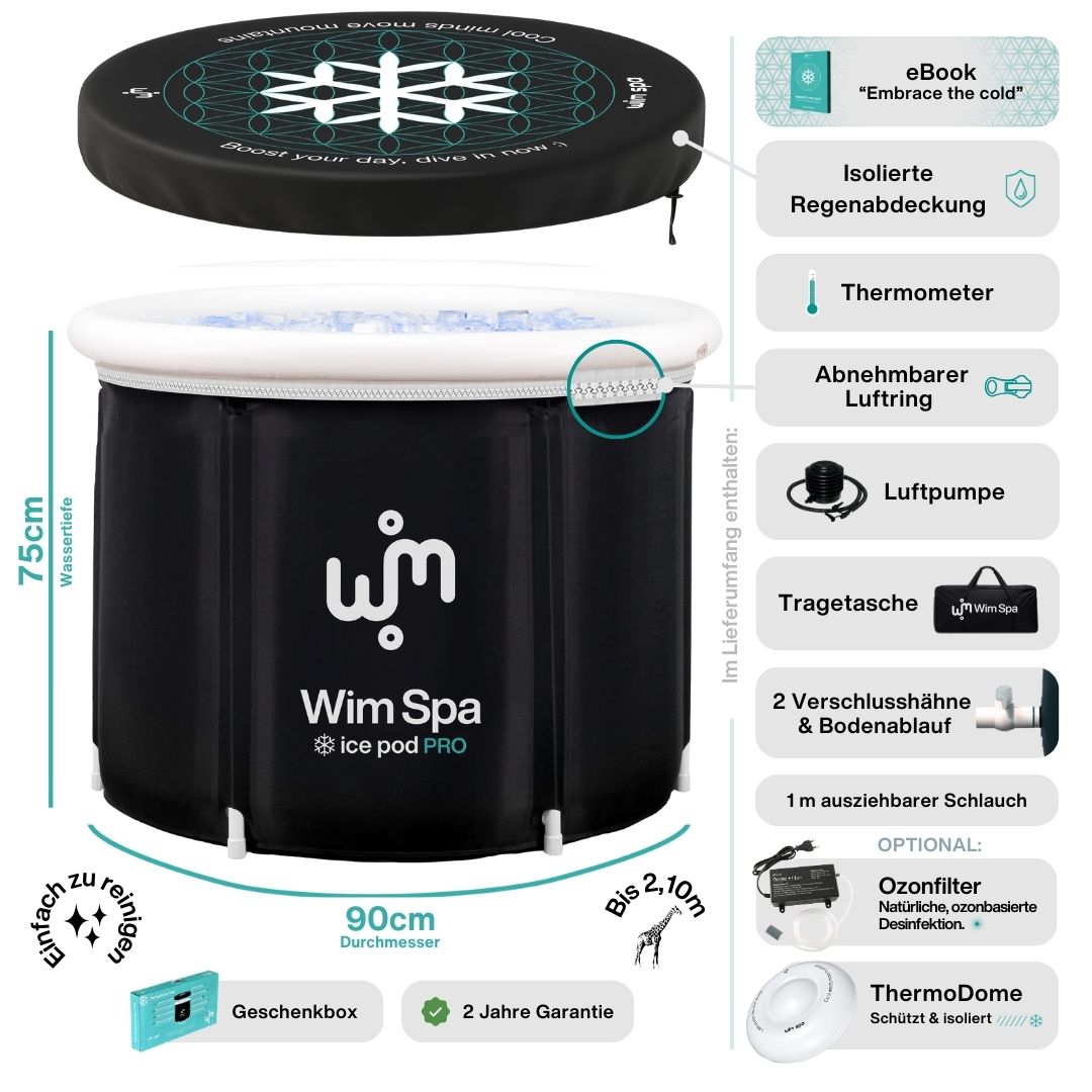 The WimSpa Ice Pod Set contains everything you need for effective ice bathing: Pump, seat cushion, thermometer, drain hose and protective cover – compact and well-designed. With the carrying bag, repair patches and an e-book with tips, you are perfectly prepared for your cold routine at home or on the go.